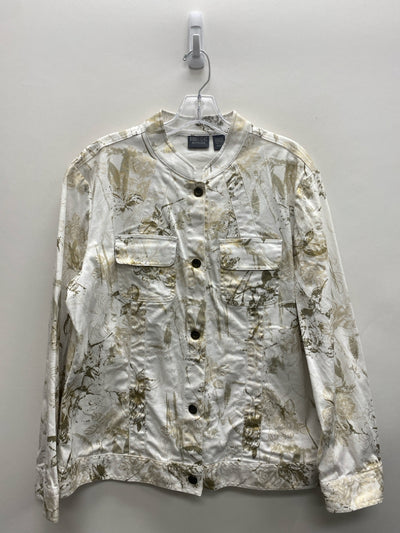 Chico's Size 3 White/Gold Olive Green Floral Button Up Ladies Jacket