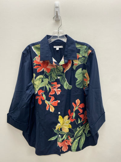 Chico's Size 3 Navy Coral/Green Floral Button Up Ladies Top