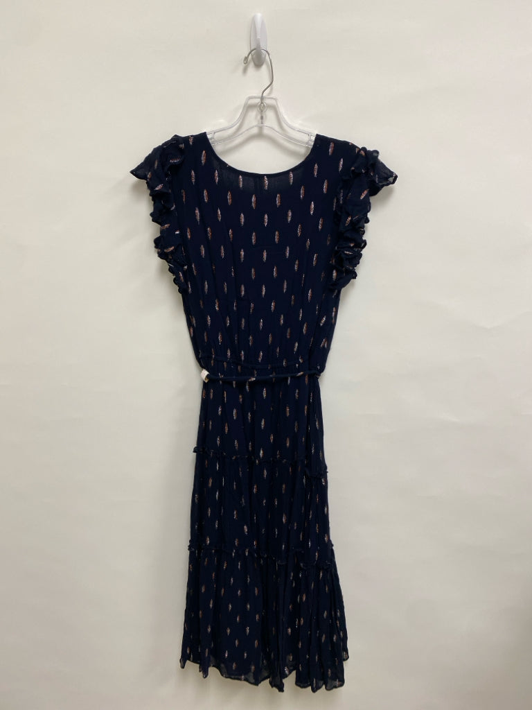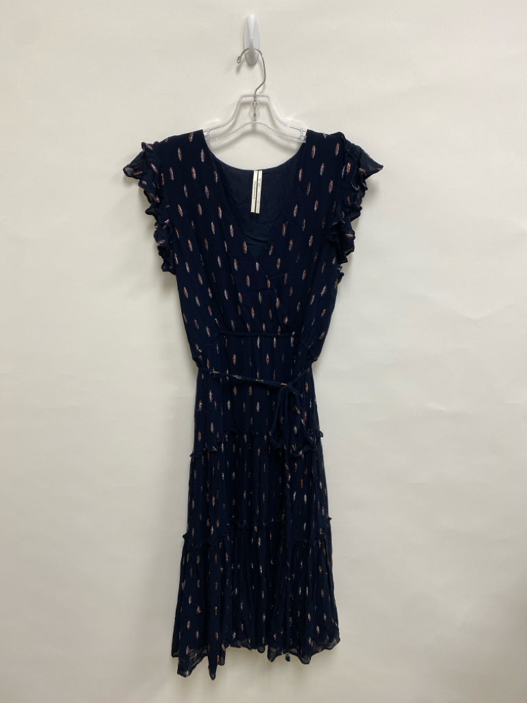 Anthropologie Size L Navy Silver/Bronze Ruffles V Neck Ladies Dress