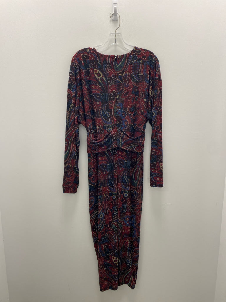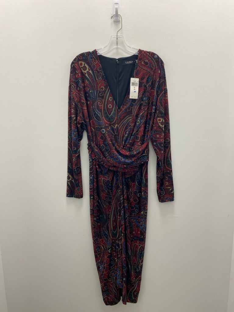 Ralph Lauren Size 12 Burgundy/Black Tan/blue Paisley V Neck Ladies Dress