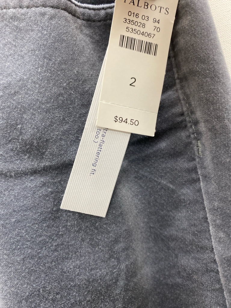 [{"id":41913776570471,"title":"2","option1":"2","option2":null,"option3":null,"sku":"26776-1870","requires_shipping":true,"taxable":true,"featured_image":null,"available":true,"name":"Talbots Size 2 Gray Velour Ladies Pants - 2","public_title":"2","options":["2"],"price":4200,"weight":907,"compare_at_price":null,"inventory_management":"shopify","barcode":"03973385","requires_selling_plan":false,"selling_plan_allocations":[]}]