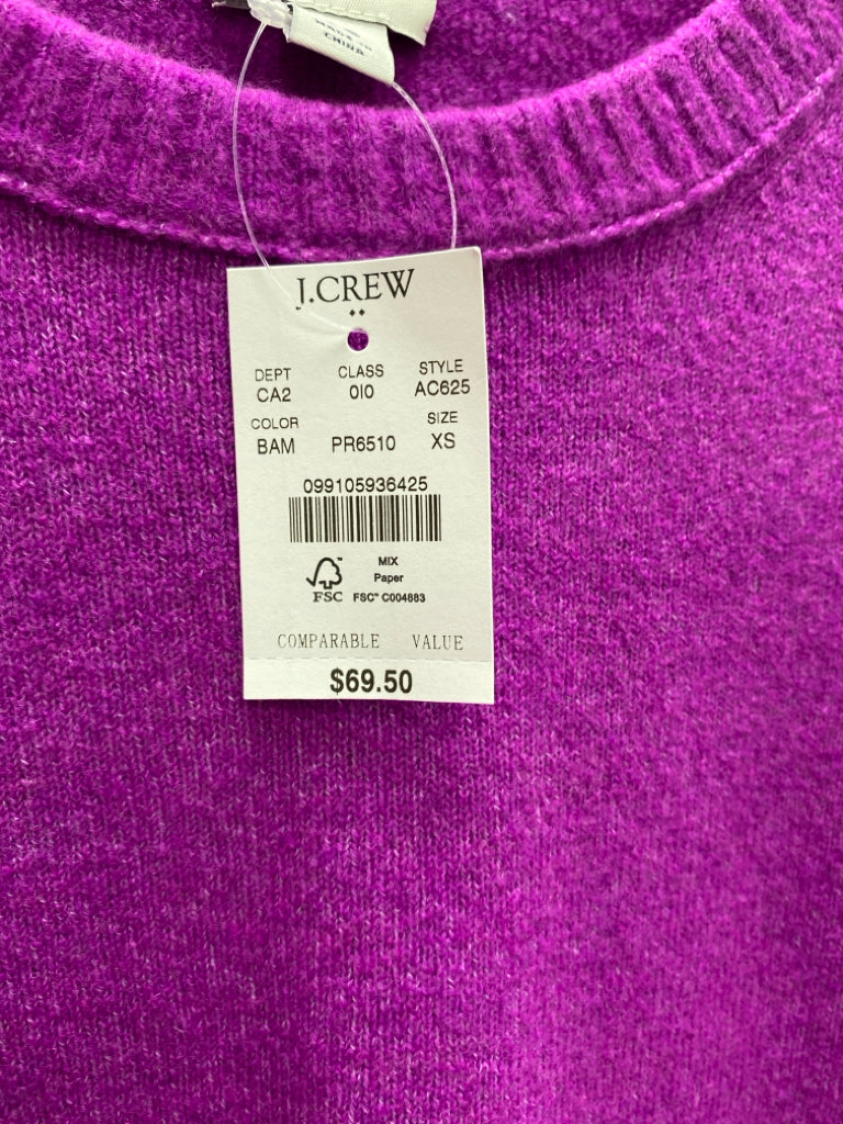 [{"id":41913799311463,"title":"XS","option1":"XS","option2":null,"option3":null,"sku":"15540-2488","requires_shipping":true,"taxable":true,"featured_image":null,"available":true,"name":"J Crew Size XS Magenta Ladies Sweater - XS","public_title":"XS","options":["XS"],"price":3400,"weight":454,"compare_at_price":null,"inventory_management":"shopify","barcode":"03974252","requires_selling_plan":false,"selling_plan_allocations":[]}]