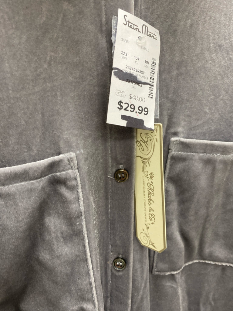 [{"id":41928731983975,"title":"S","option1":"S","option2":null,"option3":null,"sku":"14906-36178","requires_shipping":true,"taxable":true,"featured_image":null,"available":true,"name":"Size S Gray Button Up Velour Ladies Top - S","public_title":"S","options":["S"],"price":1600,"weight":454,"compare_at_price":null,"inventory_management":"shopify","barcode":"03976042","requires_selling_plan":false,"selling_plan_allocations":[]}]