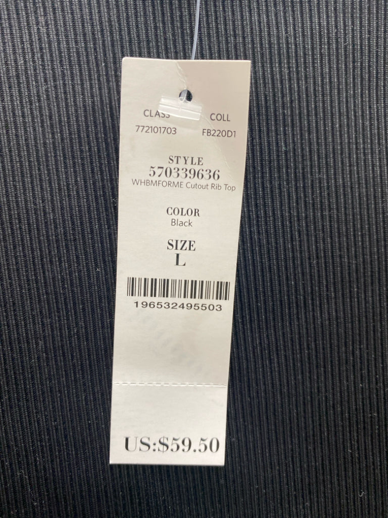 [{"id":41948253290599,"title":"L","option1":"L","option2":null,"option3":null,"sku":"12447-993","requires_shipping":true,"taxable":true,"featured_image":null,"available":true,"name":"Wht House\/Blk Mkt Size L Black Cut-Out Ladies Top - L","public_title":"L","options":["L"],"price":2600,"weight":454,"compare_at_price":null,"inventory_management":"shopify","barcode":"03977729","requires_selling_plan":false,"selling_plan_allocations":[]}]