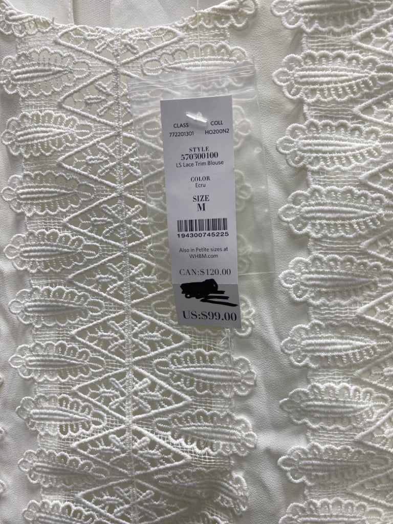 [{"id":41929005072487,"title":"M","option1":"M","option2":null,"option3":null,"sku":"14906-36153","requires_shipping":true,"taxable":true,"featured_image":null,"available":true,"name":"Wht House\/Blk Mkt Size M White Embroidered Ladies Top - M","public_title":"M","options":["M"],"price":3600,"weight":454,"compare_at_price":null,"inventory_management":"shopify","barcode":"03976007","requires_selling_plan":false,"selling_plan_allocations":[]}]