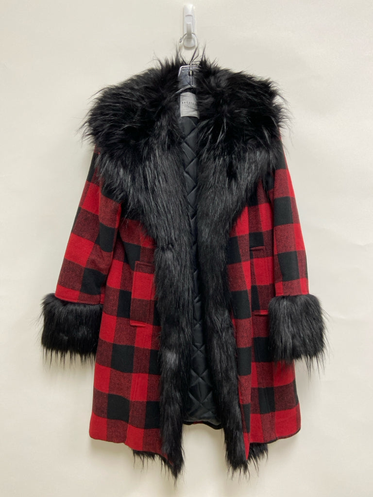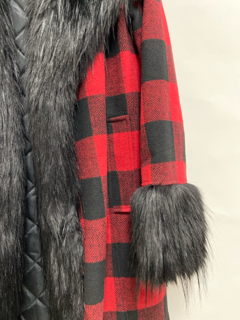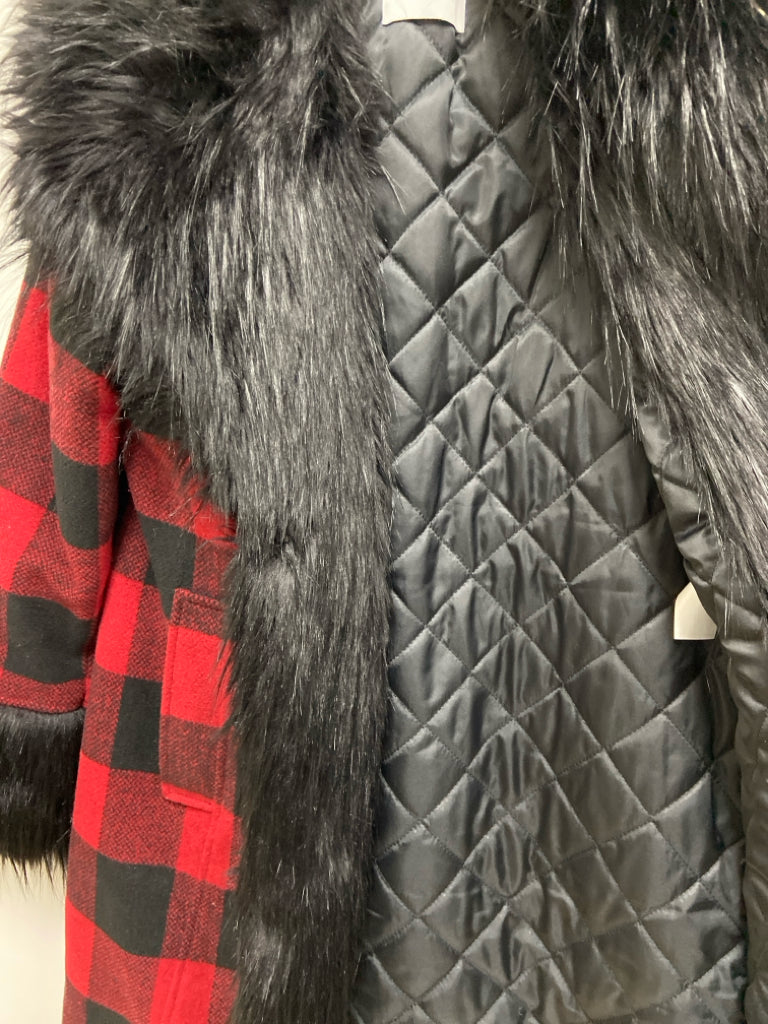 BAGATELLE Size M Red/Black Buffalo Check Button Up Faux Fur Trimmed Ladies Coat