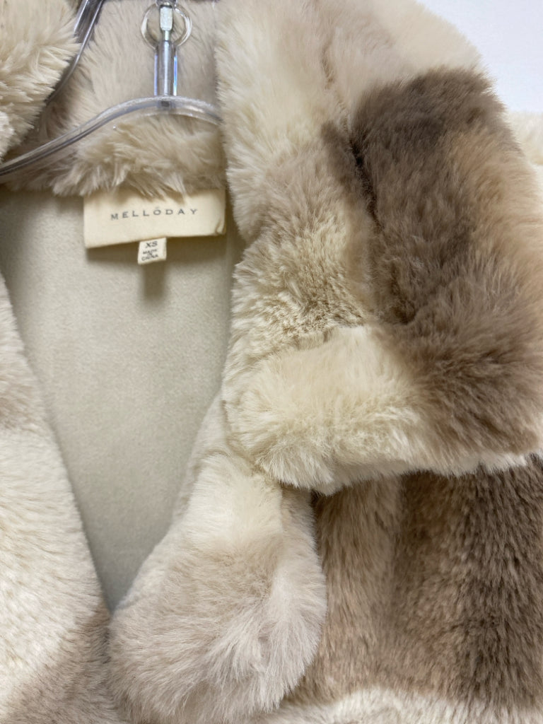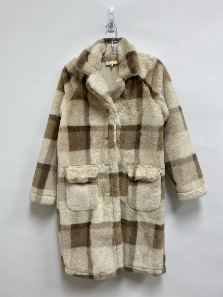 MELLODAY Size XS Cream/Taupe Tan Plaid Button Up Faux Fur Ladies Coat