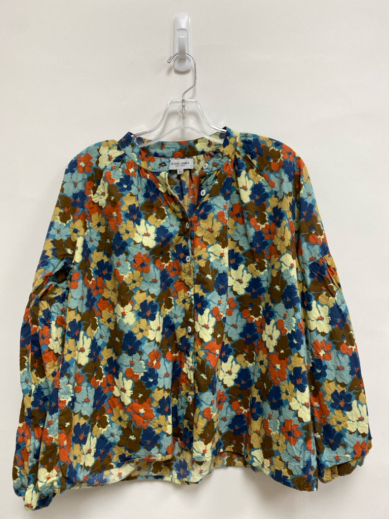 OLIVIA JAMES Size XS Blue/Cream Terra Cotta/Tan Floral Puff Sleeve Ladies Top