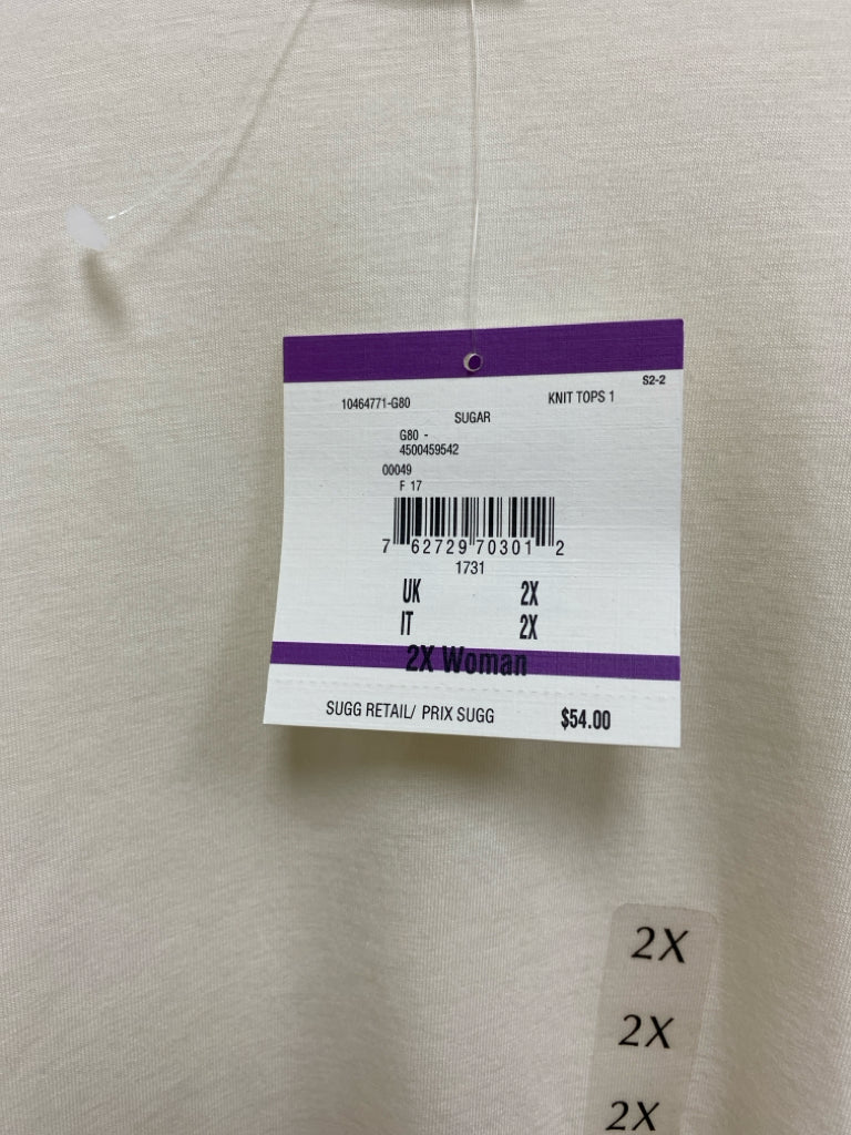 [{"id":42096341450855,"title":"2X","option1":"2X","option2":null,"option3":null,"sku":"29108-30","requires_shipping":true,"taxable":true,"featured_image":null,"available":true,"name":"Anne Klein SIZE 2X Cream Plus Size Top - 2X","public_title":"2X","options":["2X"],"price":2400,"weight":907,"compare_at_price":null,"inventory_management":"shopify","barcode":"03990893","requires_selling_plan":false,"selling_plan_allocations":[]}]