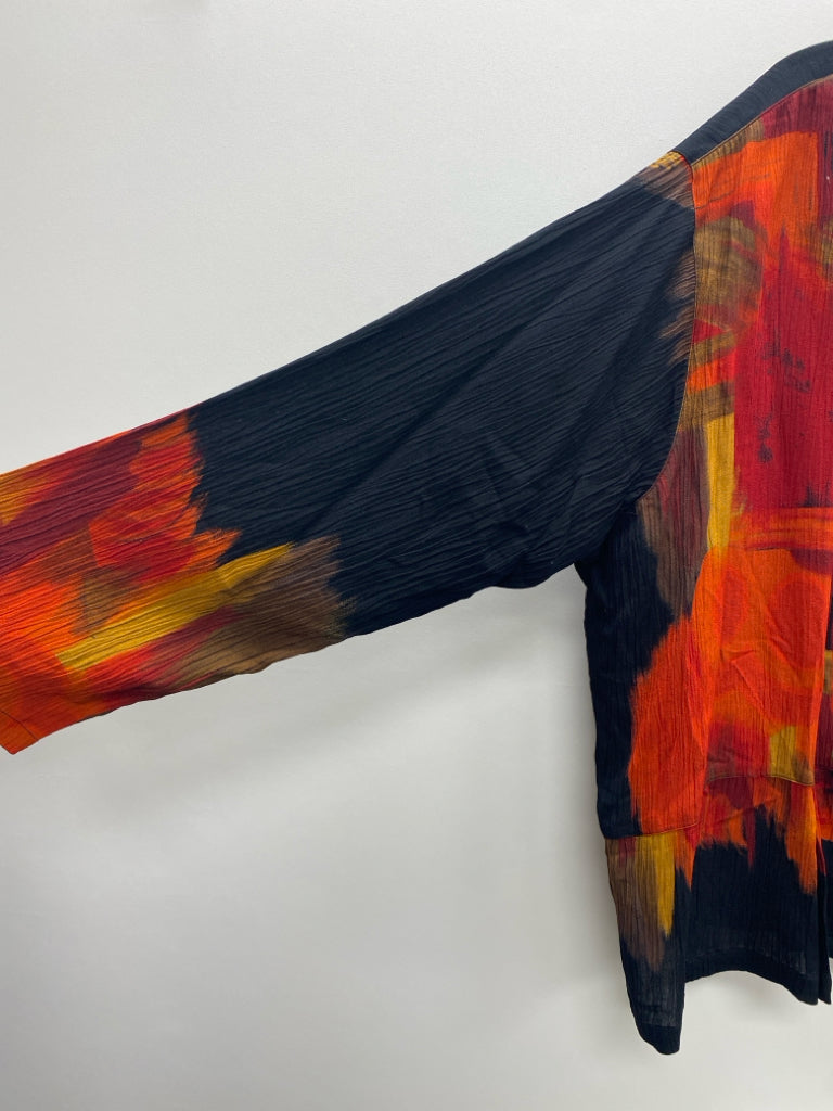 SIZE 2X Black/Orange Red/Gold Abstract Button Up Plus Size Top
