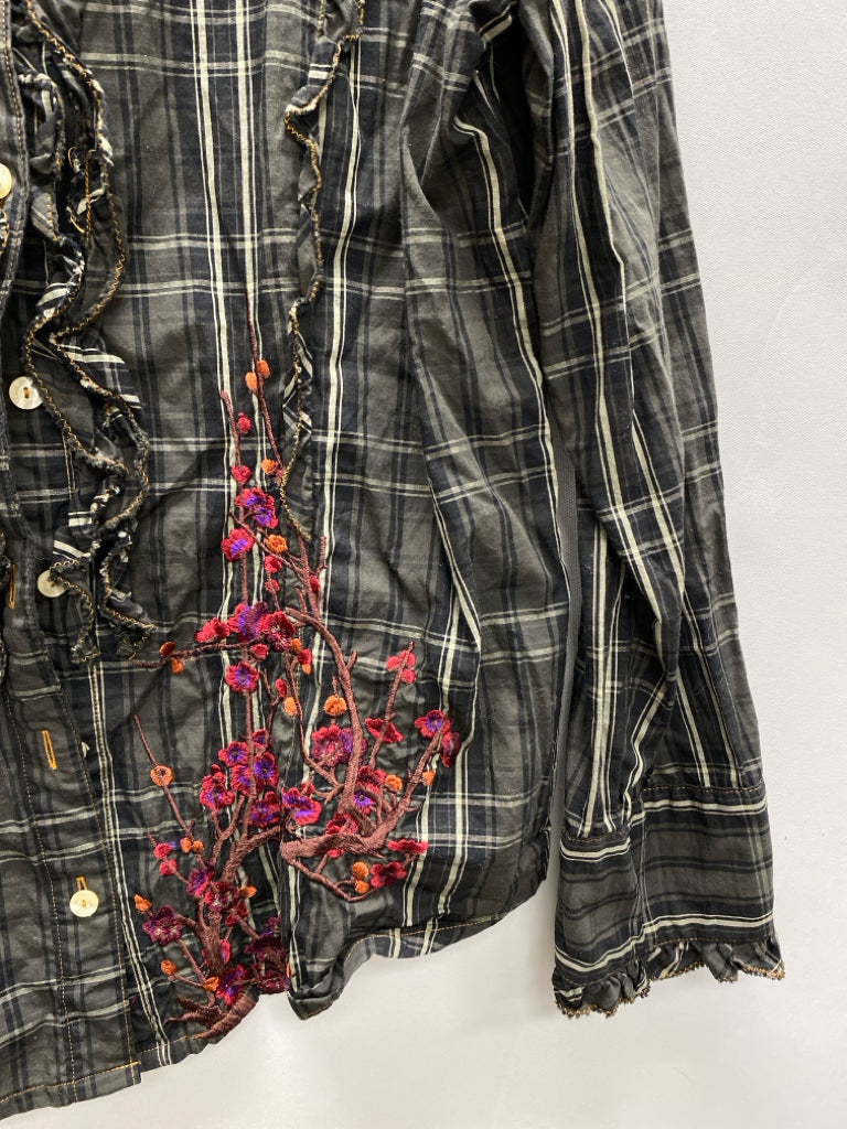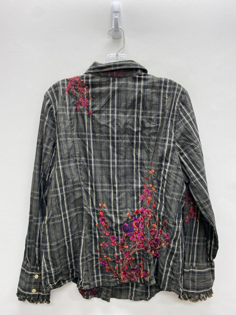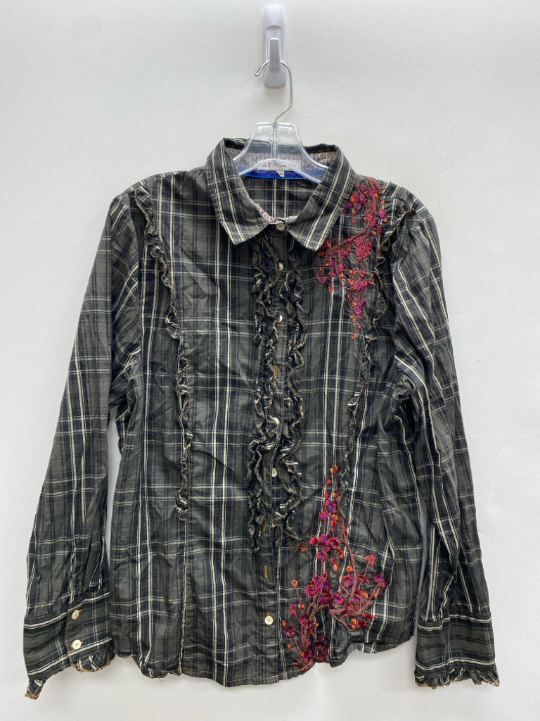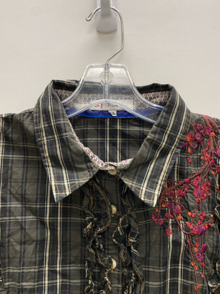 3J Workshop Size XL Gray/Black Cream/Multi Plaid Embroidered Ladies Top