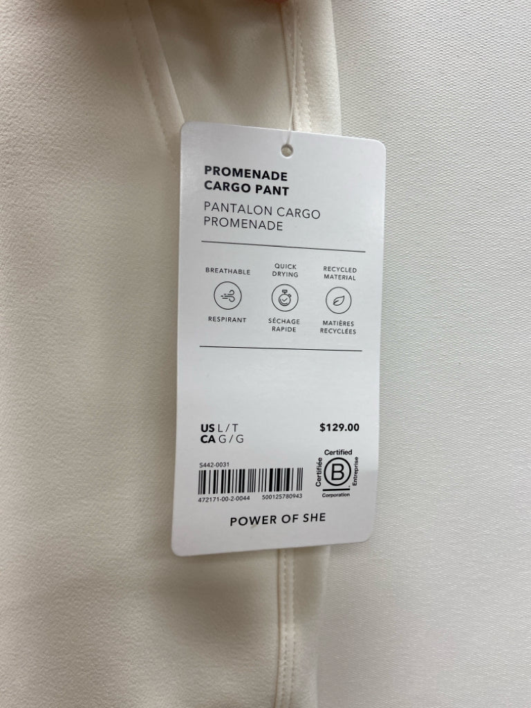 [{"id":41814196748391,"title":"L","option1":"L","option2":null,"option3":null,"sku":"15655-3453","requires_shipping":true,"taxable":true,"featured_image":null,"available":true,"name":"Athleta Size L White Cargo Style Athletic Pants - L","public_title":"L","options":["L"],"price":4800,"weight":454,"compare_at_price":null,"inventory_management":"shopify","barcode":"03960371","requires_selling_plan":false,"selling_plan_allocations":[]}]