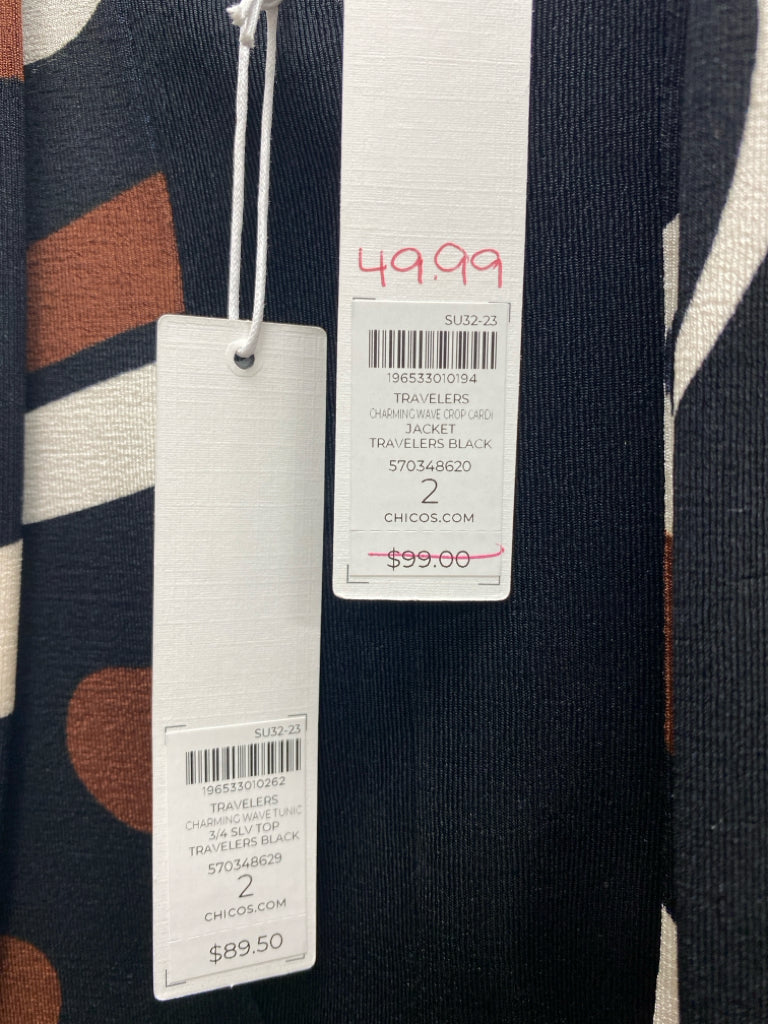 [{"id":41771275649127,"title":"2","option1":"2","option2":null,"option3":null,"sku":"17131-352","requires_shipping":true,"taxable":true,"featured_image":null,"available":true,"name":"Chico's Size 2 Black White\/Brown Shapes Ladies Jacket - 2","public_title":"2","options":["2"],"price":5600,"weight":1361,"compare_at_price":null,"inventory_management":"shopify","barcode":"03951287","requires_selling_plan":false,"selling_plan_allocations":[]}]
