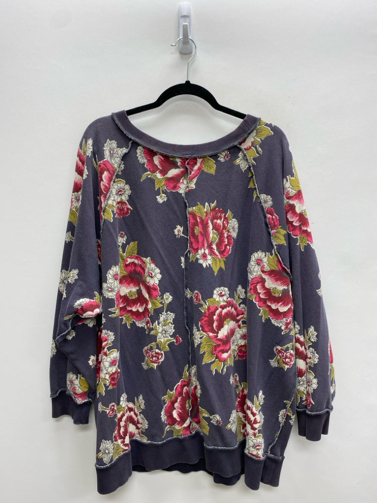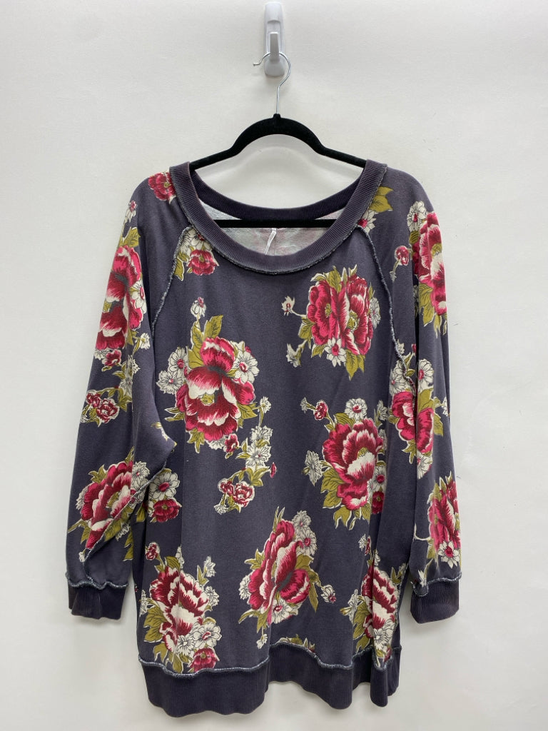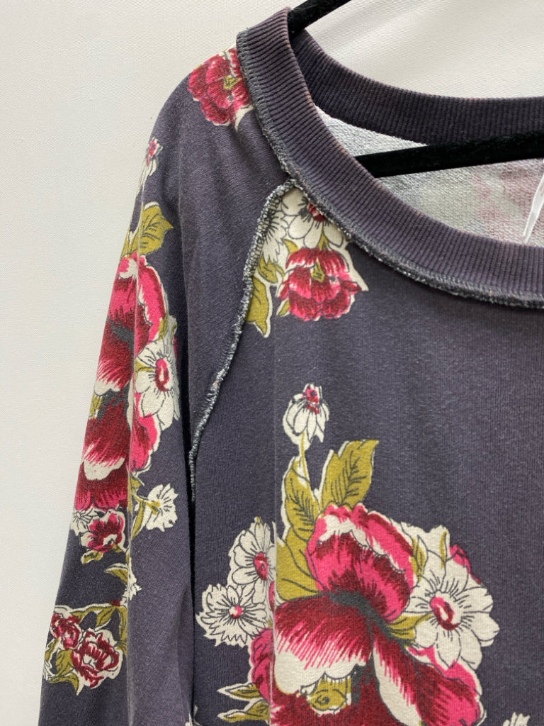 Free People Size L Gray/Cream Red/Green Flowers Ladies Top