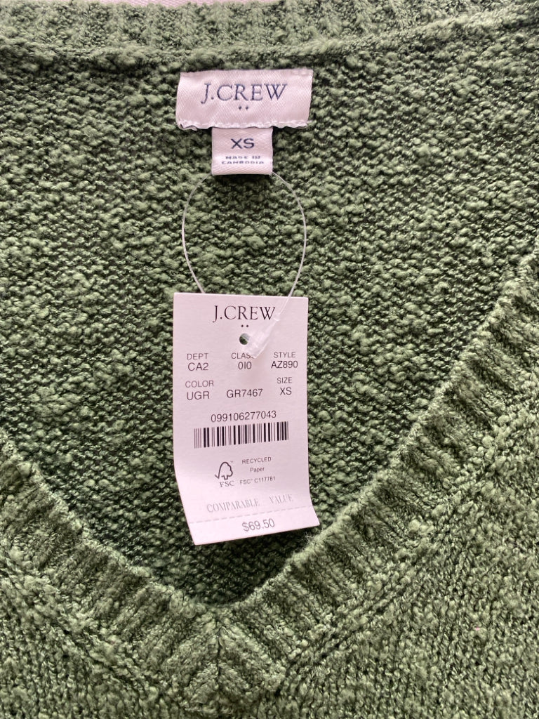 [{"id":41764128424039,"title":"XS","option1":"XS","option2":null,"option3":null,"sku":"15540-2451","requires_shipping":true,"taxable":true,"featured_image":null,"available":true,"name":"J Crew Size XS Green V Neck Ladies Sweater - XS","public_title":"XS","options":["XS"],"price":3200,"weight":454,"compare_at_price":null,"inventory_management":"shopify","barcode":"03949745","requires_selling_plan":false,"selling_plan_allocations":[]}]
