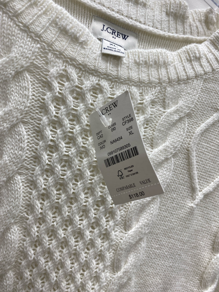 [{"id":41799029751911,"title":"XS","option1":"XS","option2":null,"option3":null,"sku":"5026-4971","requires_shipping":true,"taxable":true,"featured_image":null,"available":true,"name":"J Crew Size XS White Cable Knit Ladies Sweater - XS","public_title":"XS","options":["XS"],"price":3800,"weight":454,"compare_at_price":null,"inventory_management":"shopify","barcode":"03957703","requires_selling_plan":false,"selling_plan_allocations":[]}]