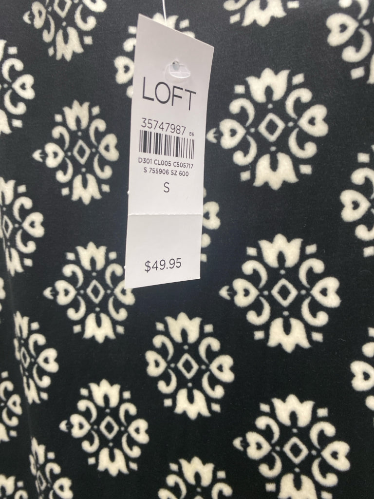 [{"id":41697010122855,"title":"S","option1":"S","option2":null,"option3":null,"sku":"15249-688","requires_shipping":true,"taxable":true,"featured_image":null,"available":true,"name":"LOFT Size S Black White Medallion Ladies Top - S","public_title":"S","options":["S"],"price":2600,"weight":454,"compare_at_price":null,"inventory_management":"shopify","barcode":"03943027","requires_selling_plan":false,"selling_plan_allocations":[]}]