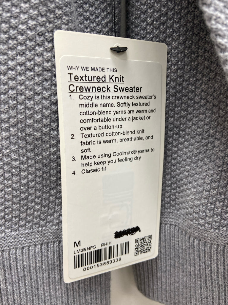[{"id":41787580383335,"title":"M","option1":"M","option2":null,"option3":null,"sku":"12552-1532","requires_shipping":true,"taxable":true,"featured_image":null,"available":true,"name":"Lululemon Size M Gray Waffle Ladies Sweater - M","public_title":"M","options":["M"],"price":6000,"weight":454,"compare_at_price":null,"inventory_management":"shopify","barcode":"03955589","requires_selling_plan":false,"selling_plan_allocations":[]}]