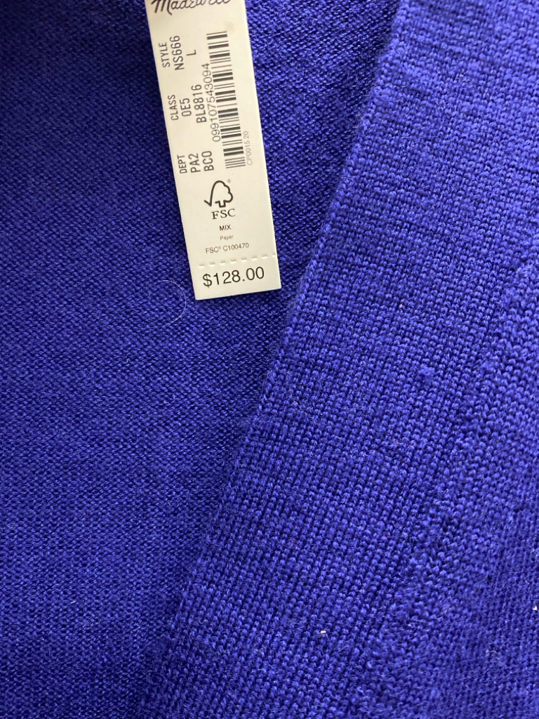 [{"id":41806960984167,"title":"L","option1":"L","option2":null,"option3":null,"sku":"15703-1951","requires_shipping":true,"taxable":true,"featured_image":null,"available":true,"name":"Madewell Size L Dark Purple Cardigan Ladies Sweater - L","public_title":"L","options":["L"],"price":3750,"weight":454,"compare_at_price":5000,"inventory_management":"shopify","barcode":"03958440","requires_selling_plan":false,"selling_plan_allocations":[]}]