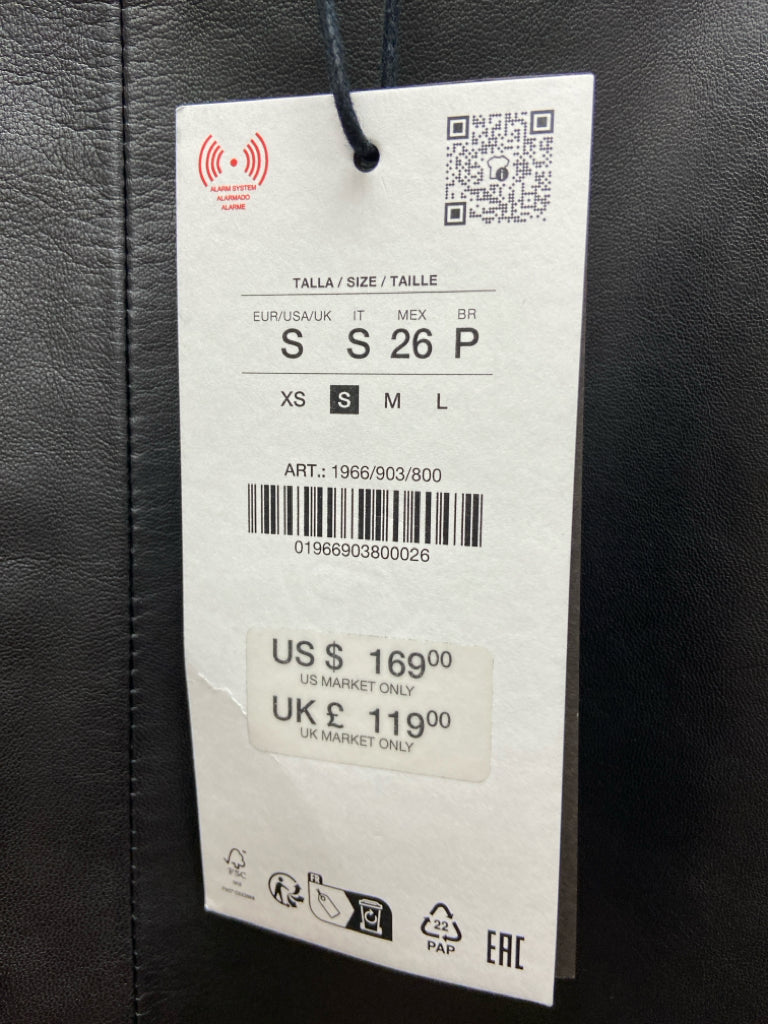 [{"id":41686690562151,"title":"S","option1":"S","option2":null,"option3":null,"sku":"26817-665","requires_shipping":true,"taxable":true,"featured_image":null,"available":true,"name":"Zara Size S Black Leather Ladies Skirt - S","public_title":"S","options":["S"],"price":6000,"weight":907,"compare_at_price":null,"inventory_management":"shopify","barcode":"03941877","requires_selling_plan":false,"selling_plan_allocations":[]}]